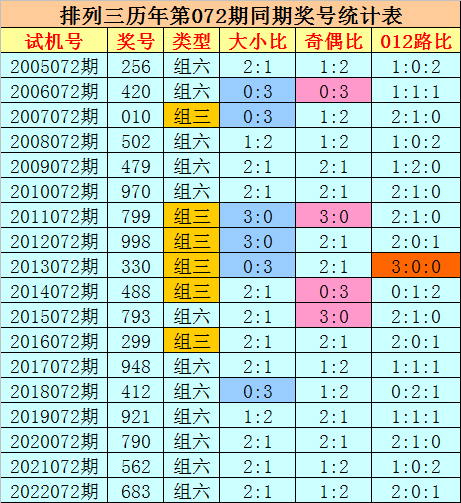 组选类型推荐:历史上排列三第072期同期奖号中,组六出现12期,组三出现6次,今年第072期预计奖号为组六号码。