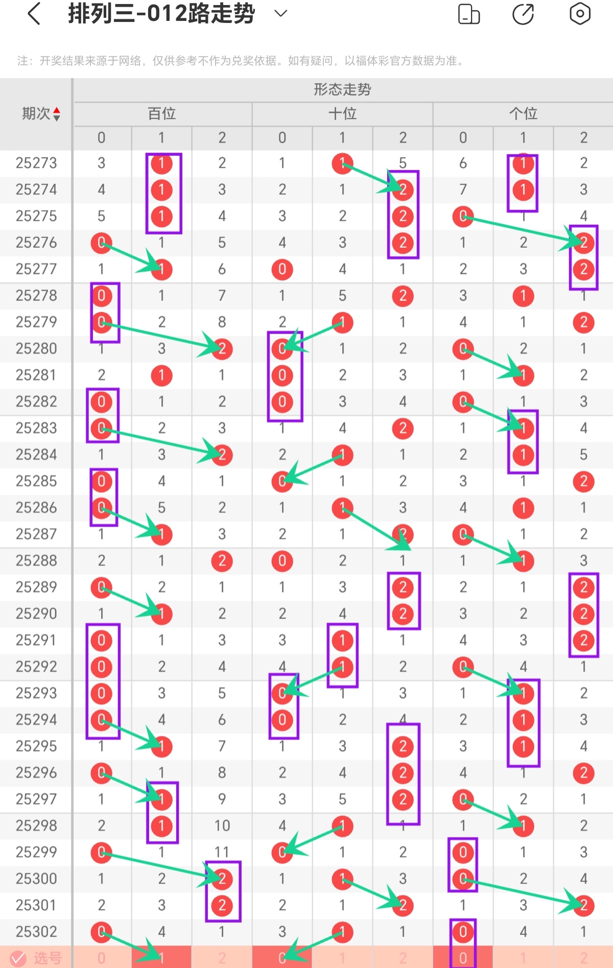 福彩3D中,012路是把0-9这10个数字按除3余数划分,0、3、6、9为0路,1、4、7为1路,2、5、8为2路。以下是对近30期百、十、个位012路形态走势分析