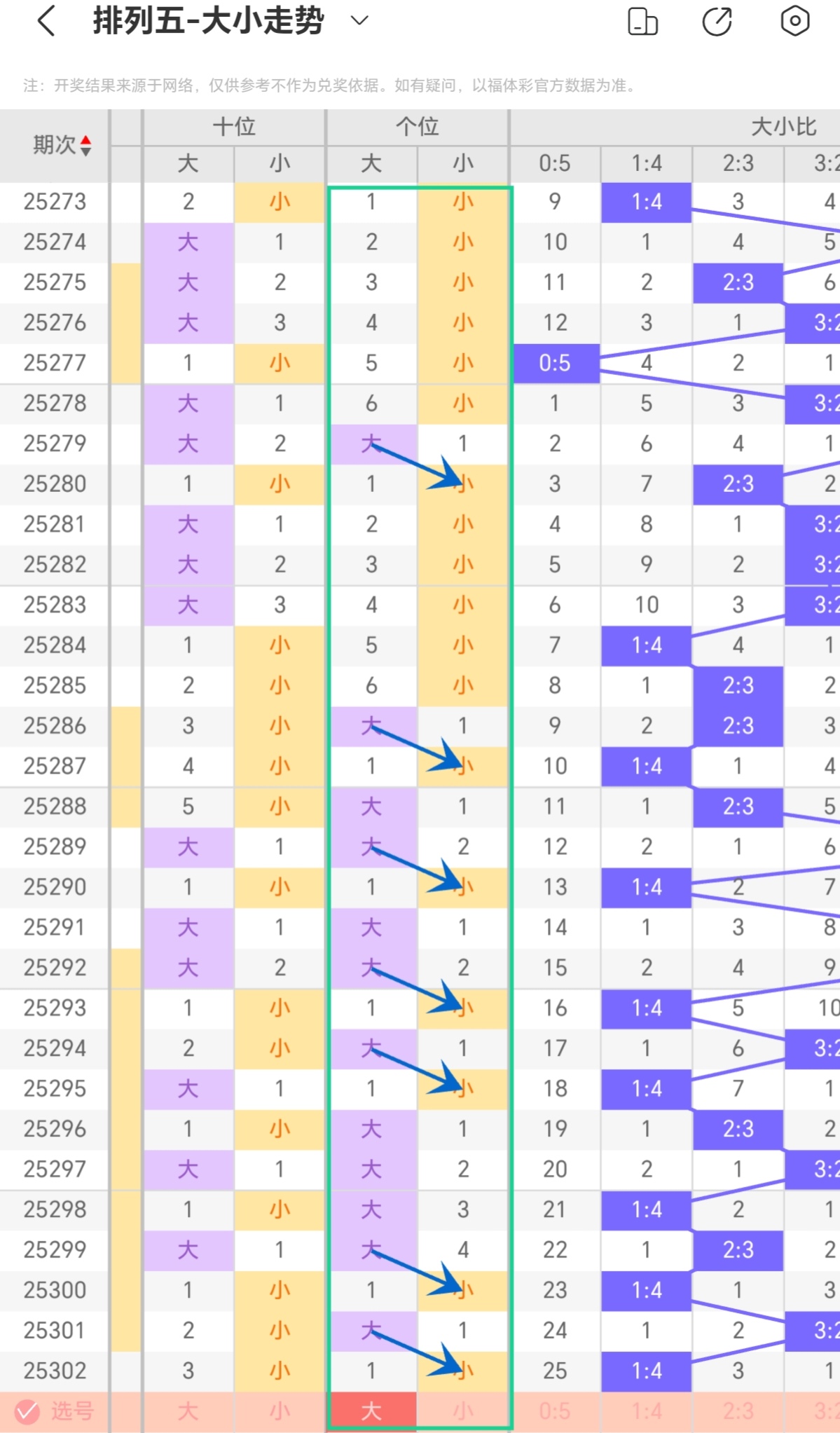 根据上图排列五十位的大小走势分析,大码常连出多次后,箭头指向小码完成回补;小码短暂出现后,又回补至大码,大码连下后,必切换为小码;小码出现1到2次后,箭头再次指向大码,形成稳定的连大回补小连大节奏。近期大码连出后,回补小码,当前小码已呈现,后续大概率再次回补大码,本期参考小号连下(01234)