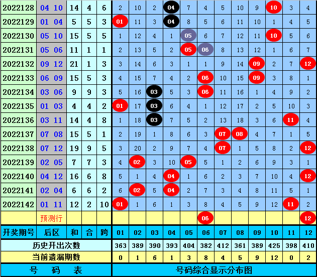 后区分析【一区01-04,二区05-08,三区09-12】:上期后区奖号为01和11,分别落在第一、三区,近50期后区三区比为37:36:27,近10期三区比为9:6:5,本期注意第二、三区号码出现,关注两码06+12。