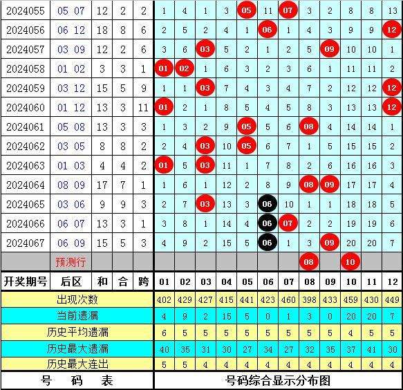 后区分析:后区上期开出号码06+09,和值为15,跨度为3。最近10区后一区(01-06)开出13个号码,断区1次,后二区(07-12)开出7个号码,断区4次,本期后一区注意号码:05、06;后二区注意号码:08、10、11、12。