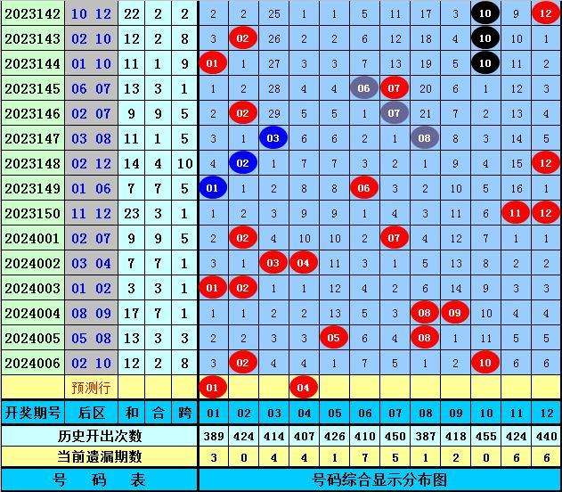 后区分析:上期后区开出奖号02和10,为2路号码和1路号码。最近7期后区012路号码个数比为3:4:7,本期看好1路号码大热,防全1组合,参考两码01、04。
