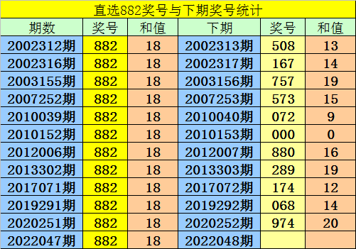 第2022047期3D奖号为:882,历史上该号码直选开出12次,下期号码分别为:508、167、757、573、072、000、880、289、174、068、974。