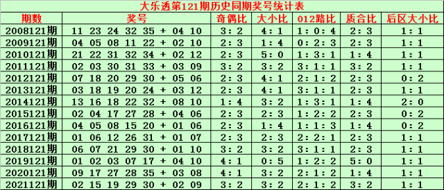 3、在历史同期第121期开奖中,前区号码大小总比例为38:32,大号表现相对较热,本期防大号走冷,参考大小比为2:3;