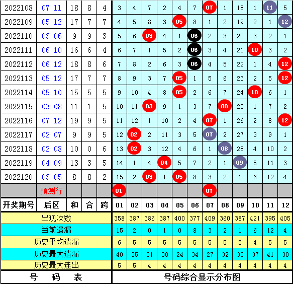 6、在历史同期第121期开奖中,后区全大组合出现1次,全小组合出现3次,一大一小组合出现10次,本期后区注意一大一小组合出现,关注号码01、03、04、07。