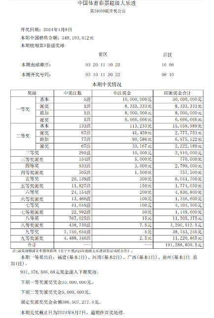 二等奖开出133注,每注基本奖金为11。3万余元;其中77注采用追加投注,多揽9万元,单注奖金20。3万余元。本期共有67注二等奖符合本次派奖参与条件,单注奖金为(基本奖金11。3万+追加奖金9万+基本奖金派奖4。1万+追加奖金派奖3。3万)27。8万余元。奖池方面,本期开奖结束后,9。31亿元滚存至4月10日(周三)开奖的第24040期。