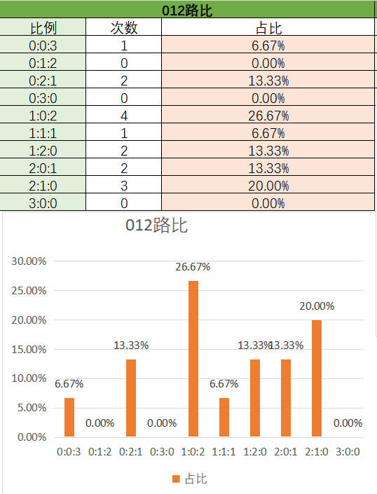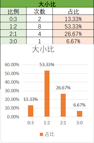 上期大小比为1:2,各个类型占比没有变化。可以看到近15期内1:2优势最好的,其次是2:1,然后是0:3,最后是3:0。本期看好2:1开出,其次是1:2。