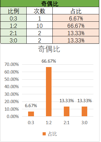上期奇偶比为2:1,其中2:1占比变大,1:2占比变小。近15期内1:2优势最大,其次是3:0和2:1,最后是0:3。上期开了2:1奇偶比,本期看好1:2奇偶比的开出,其次是2:1。
