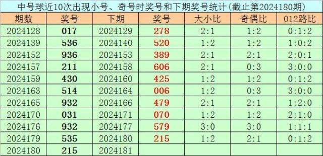 开奖回顾:体彩排列三第2024180期开出奖号215,奖号大小比开出1:2,奇偶比开出2:1,012路比开出0:1:2。