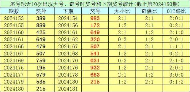 在尾号球前10次开出大号、奇号类型之后,其下期分别开出奖号:983、172、649、320、507、541、031、932、663、215,其中号码奇偶比为7:3,大小比为3:7,012路比为4:3:3。