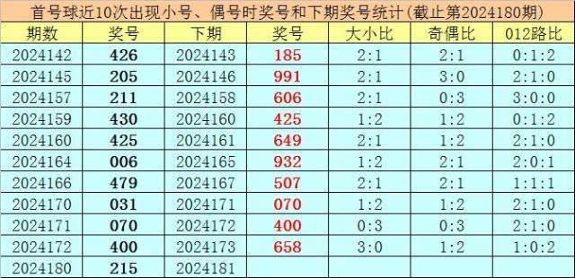 在首号球前10次开出小 号、偶号类型之后,其下期分别开出奖号:185、991、606、425、649、932、507、070、400、658,其中号码大小比为6:4,012路比为6:3:1,奇偶比为4:6。