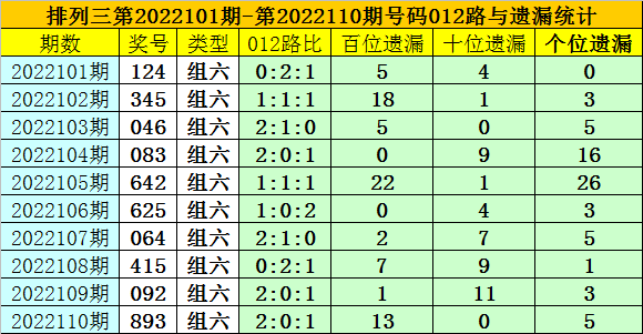 开奖回顾:排列三第2022110期奖号为:893,类型为组六,号码012路比为2:0:1,百十个位号码直选分别遗漏13期、0期和5期。