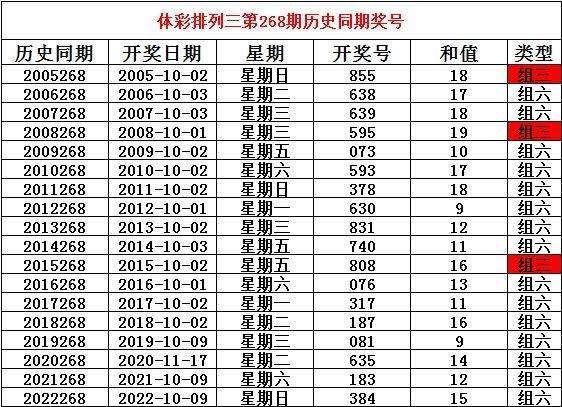 2023年10月9日排列三第268期开奖,历史同期分别开出奖号: