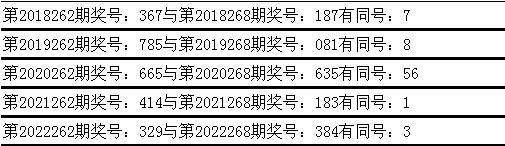 与前期历史同期奖号对比分析,在最近五年开奖中,第262期同期奖号与第268期同期奖号都出现了相同号码: