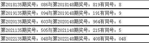 与前期历史同期奖号对比分析,在最近五年开奖中,第135期同期奖号与第148期同期奖号都出现了相同号码: