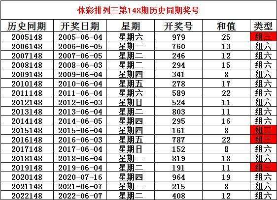 2023年6月7日排列三第148期开奖,历史同期分别开出奖号: