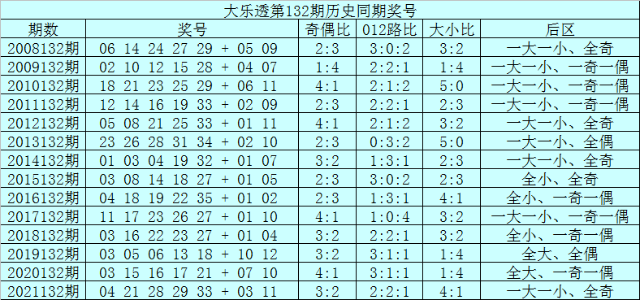 后区第一位分析:在历史第132期同期奖号中,后区第一位号码全部在01-10区段出现,其中该位号码奇偶比为9:5,大小比为2:12,012路比为2:9:3,本期第一位号码参考07。