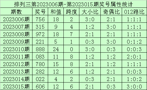 上期回顾:排列三第2023015期开奖号:606,奖号和值:12,奇偶比0:3,大小比2:1。
