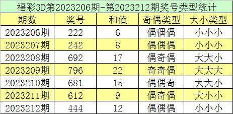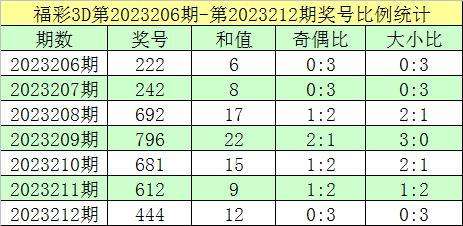 福彩3D第2023212期回顾:奖号为444,奖号奇偶比为0:3,大小比为0:3,和值为12,类型为豹子。