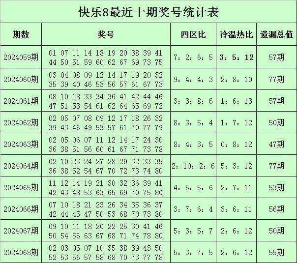 福彩快乐8第2024068期开奖回顾:02 03 05 07 10 35 38 39 43 50 52 53 56 57 58 68 70 73 77 78,其中奖号四区比为5:3:7:5,冷温热码比为2:6:12,遗漏总值为55。