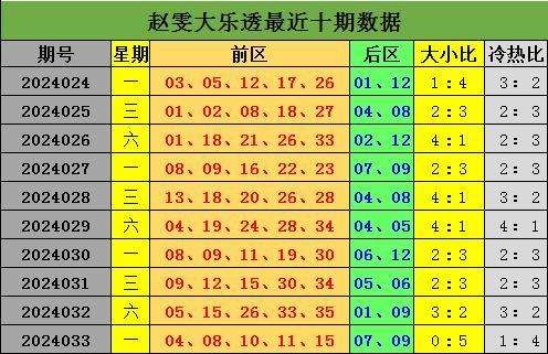上期回顾,大乐透第2024033开奖,本期奖号:前区04 08 10 11 15;后区07 09,当期前区号码大小比为0:5,三区比4:1:0,奇偶比2:3。前区开出连号10 11,开出重号15。