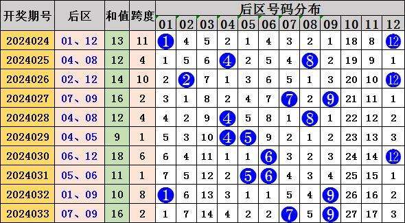 后区走势分析:上期开出号码07 09,近10期跨度11、4、10、2、4、1、6、1、8、2,推荐跨度4,本期后区大范围推荐:01 03 07 08 12,主推号码:03 07。