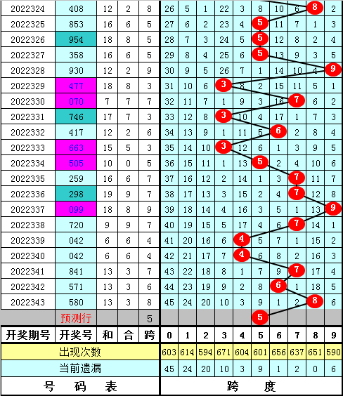 福彩3D第2022343期最大跨度开出8,跨度近期分布比较密集,主要分布在4-8区段,本期预计最大跨度在3-7区段出现,最大跨度关注34567,精选跨度5。