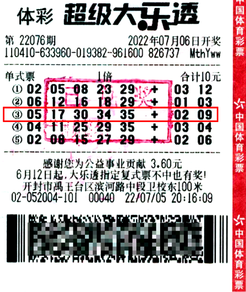 开奖当晚,忙了一天的赵先生摸到衣服里的大乐透彩票,就随手在手机上查看了当天的中奖号码,惊喜地发现自己彩票上的第3注号码“05、17、30、34、35+02、09”与当期中奖号码一模一样。
