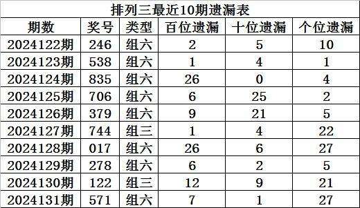 上期回顾:排列三第2024131期奖号:571,组六,直选遗漏总值为35期。