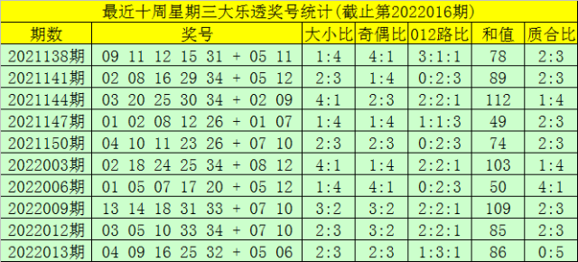 其中,号码奇偶比为5:7,偶数号码相对较热,012路比为4:3:5,1路号码走势较冷,质合比为3:9;