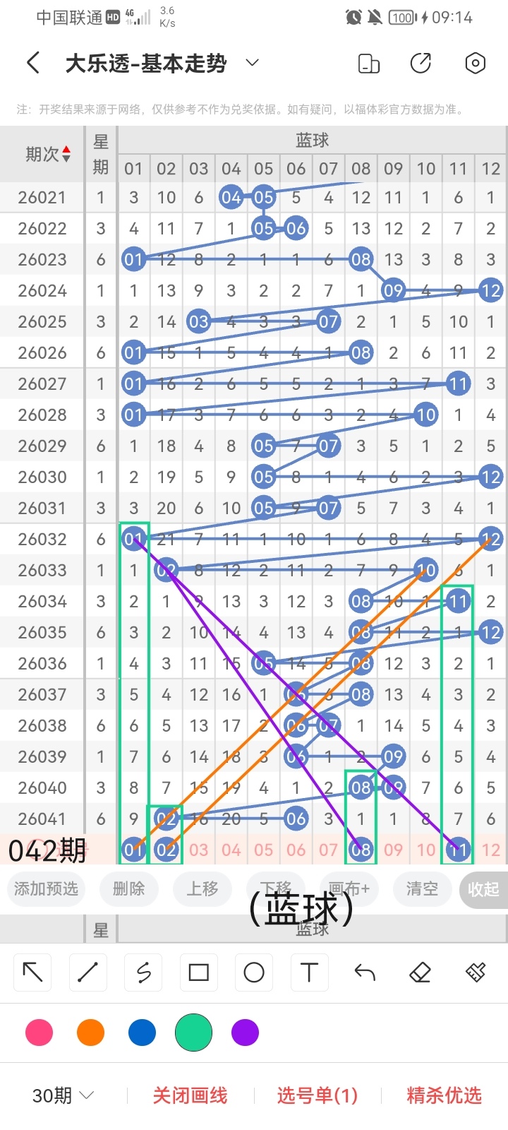 小梁根据上图中画线的思路走势分析,最后给大家汇总一下大乐透本期红球、蓝球数据,供大家参考: