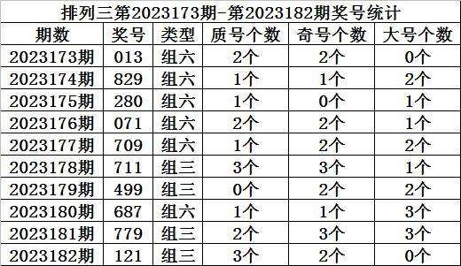 上期回顾:排列三第2023182期开奖:121,质合比为3:0,奇偶比为0:3,大小比为2:1。