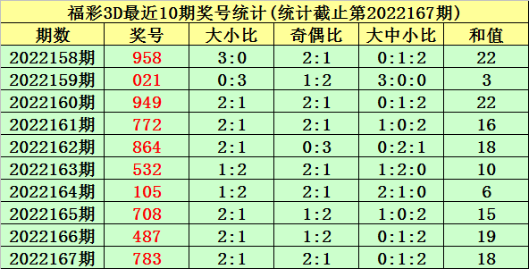 开奖回顾:福彩3D第2022167期奖号为:783。奖号类型为组六,和值为18,奇偶比为2:1,跨度为5,012路比为1:1:1,大小比为2:1。