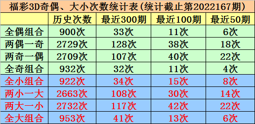 奇偶、大小分析:在最近50期开奖中,全偶组合开出6次,当前遗漏5期、两偶一奇组合开出18次,当前遗漏1期、两奇一偶组合开出22次,当前遗漏0期、全奇组合开出4次,当前遗漏15期,本期注意两奇一偶组合;全小组合出现8期,当前轮空8期、两小一大组合出现14期,当前轮空3期、两大一小组合出现22期,当前轮空0期、全大组合出现6期,当前轮空9期,本期看好开出两大一小组合。