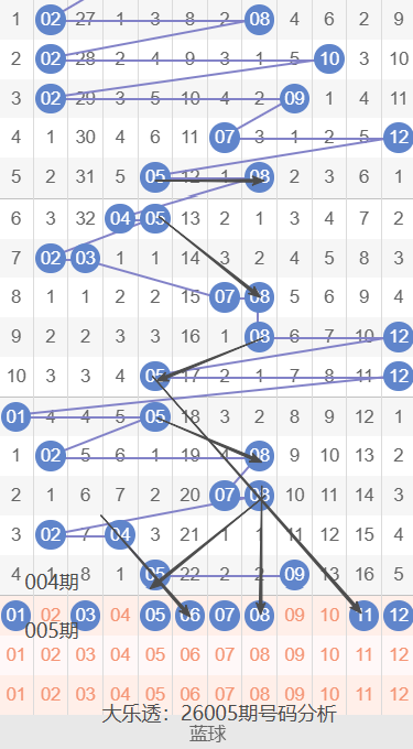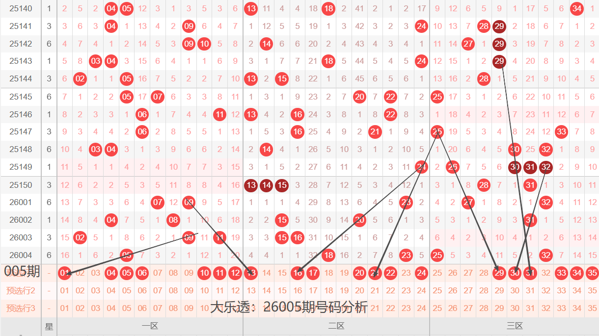 通过上期号码的简单分析,我们看下26005期红色号码球的总体走势,如下图:
