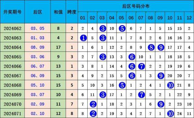 上期后区号码为02号和10号,为小大偶偶组合,近10期奇偶比12:8,奇号球出号较热,预计本期奇奇组合出现,本期推荐03 09。