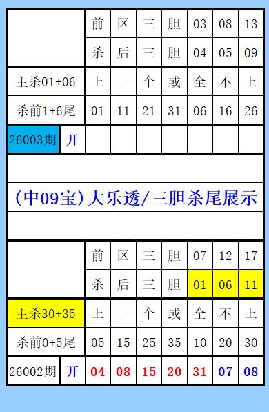 杀前区尾号1和6。尾号1对应号码01、11、21、31。其中31在近四期出现三次(25149期、25150期、26002期),热度极为显著,根据出号节奏,该尾数可能进入短期调整阶段。尾号6对应号码06、16、26。其中26在25149期出现,06和16在近四期未出现,该尾数整体活跃度较低,短期内再次开出的动力可能不足。