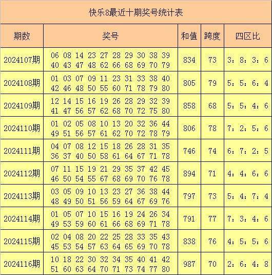 快乐8第2024116期奖号开出:10 18 22 30 32 34 35 40 41 42 51 60 63 64 70 71 73 74 77 80,其中奖号和值为987,跨度为70,四区比为2:6:4:8。