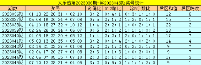 开奖回顾:体彩大乐透第23045期奖号开出:07 10 13 28 31+04 05,前区奖号和值为89,跨度为24,除5余数比为1:1:1:2:0,遗漏总值为29,后区奖号和值为9,跨度为1。