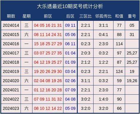 当期前区号码三区比为3:2:0,邻孤传比为3:2:0,无重号,和值为66。