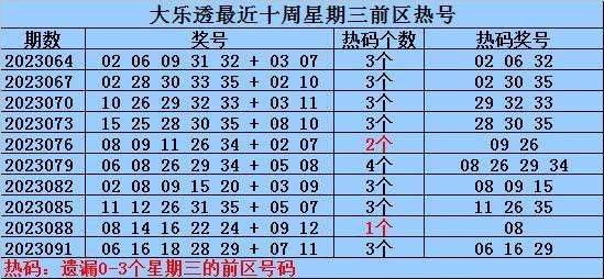 热号:最近十周星期三前区开出28个热号,上周星期三前区开出3个热号,本周星期三注意热号26 28。