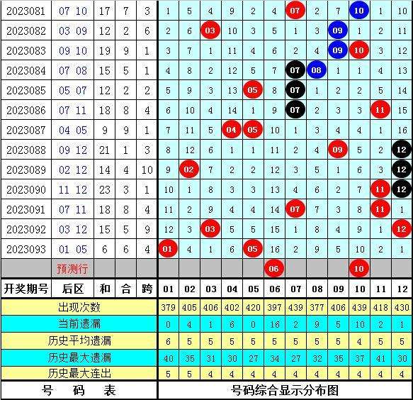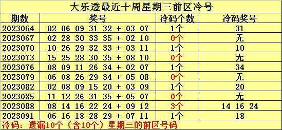冷号:最近十周星期三前区开出8个冷号,上周星期三冷号出现1个,本周星期三预计冷号强势回归,参考冷号01 05 07。
