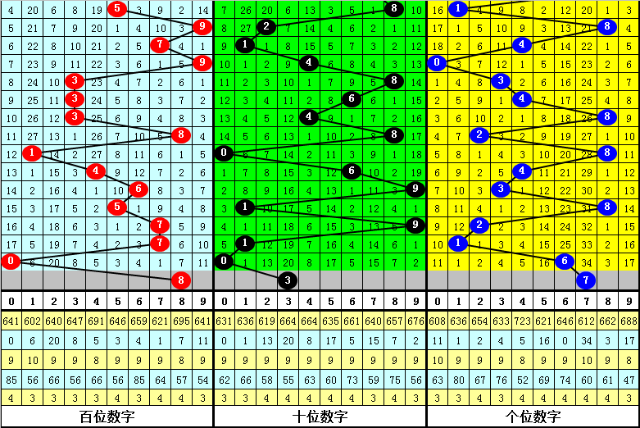 在连续10期开奖中,和值振幅分别为:1-2-3-9-5-4-4-4-9-3,逐渐下降,和值走势密集,本期预计和值波动较大,预计在中部区域开出。