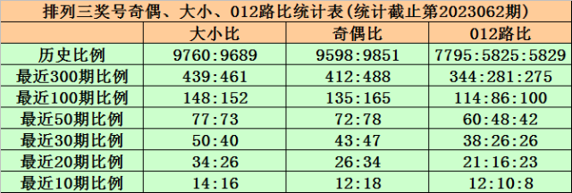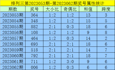 上期回顾:排列三第2023062期出现奖号006。开出组三,奇偶比0:3,012路比3:0:0,大小比1:2,和值6,跨度6。