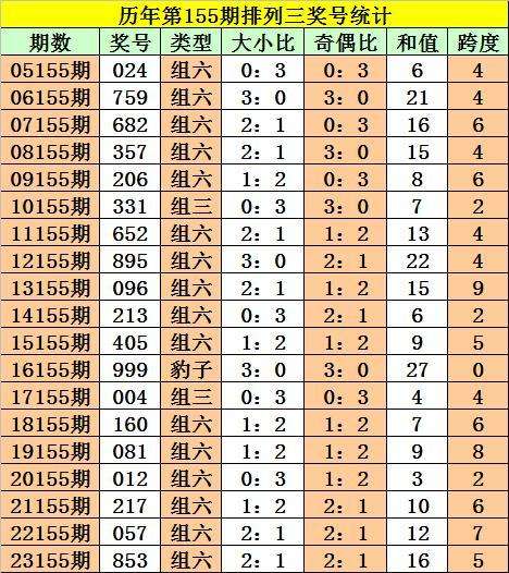 排列三第2023155期奖号:853,和值16,跨度5,大小比2:1,奇偶比2:1。