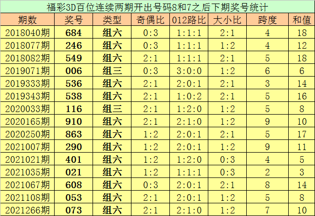 百位号码:连续两期百位出号分别为:8-7,历史上福彩3D连续两期前后分别出号8-7的奖号共出现86次。在百位8-7的奖号现象出现时,近15期下期分别出号:684-246-549-006-536-538-116-910-863-290-401-021-608-053-073;