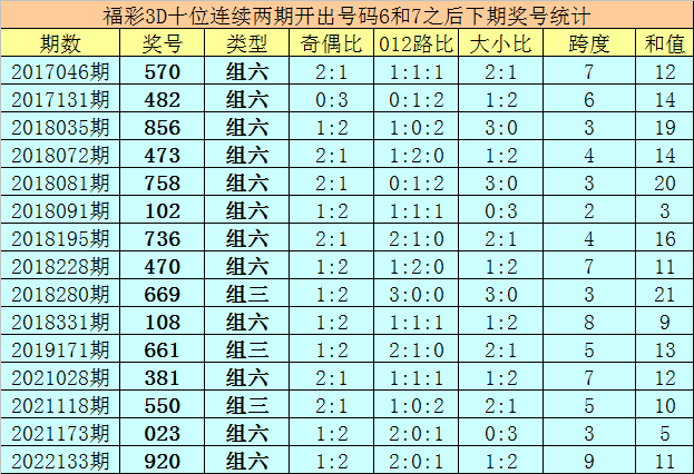 十位号码:前两期十位分别出现奖号6-7,历史上福彩3D连续前后分别开出号码6-7的现象共开出62次。在十位6-7的现象出现时,最近15期其下期分别开出号码:570-482-856-473-758-102-736-470-669-108-661-381-550-023-920;