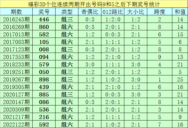 个位号码:最近两期个位开出号码为9-5,在福彩3D历史开奖中,前后两期个位分别开出号码9-5的奖号出现了61次。最近15期个位9-5组合出现之后,其下期奖号分别为:446-860-582-105-008-094-579-050-898-439-885-086-536-216-592;