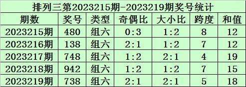 上期回顾:排列三第2023219期开奖号码为738。奖号类型为组六,奇偶比为2:1,大小比为2:1,跨度为5,和值为18。