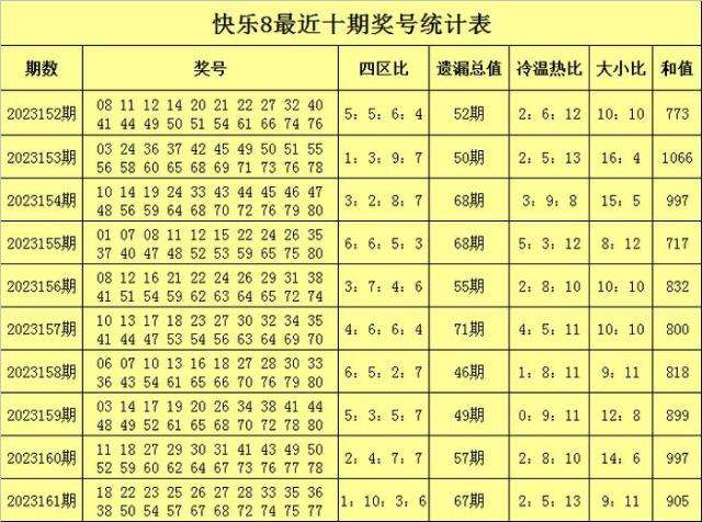 福彩快乐8第2023161期开奖回顾:18 22 23 25 26 27 28 33 35 36 38 50 54 57 67 68 72 74 75 77,其中奖号四区比为1:10:3:6,遗漏总值为67,大小比为9:11,012路比为8:4:8,和值为905。
